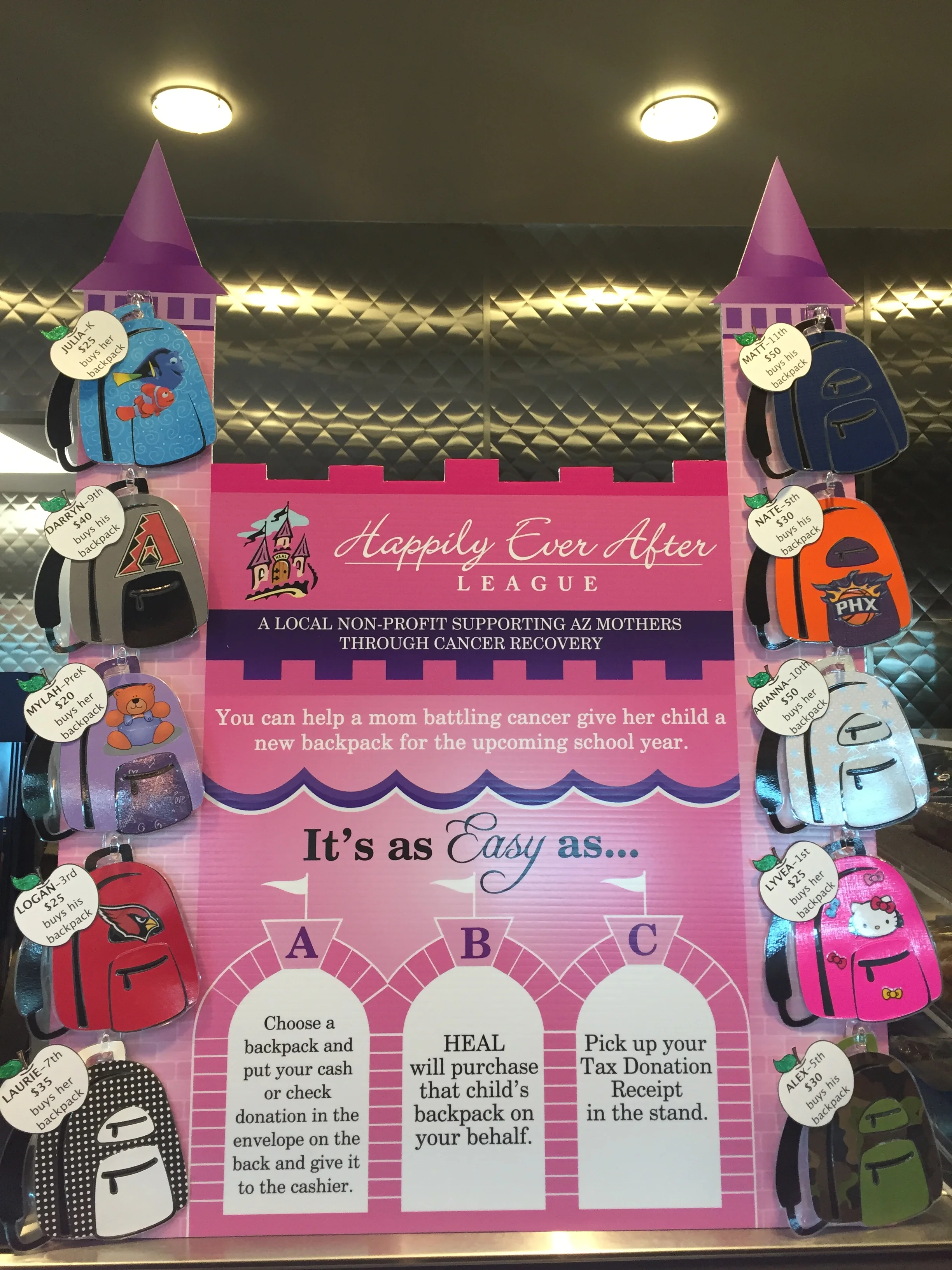 Also happening at Miracle Mile Deli from now until July 22nd, the locally owned restaurant has teamed up with local nonprofit Happily Ever After League (HEAL) to raise enough funds to fill 42 backpacks for Valley kids in need for back to school! As people walk in they will see a display at the front of the Miracle Mile Deli counter (see photo below) with information about each kid and how much their backpack costs for school! People can donate as much or as little as they want. HEAL is a 501(c)(3) non profit organization whose mission is to help nurture, facilitate, and provide support services to mothers in Arizona diagnosed with cancer, living with at least one dependent child. happilyeverafterleague.org
