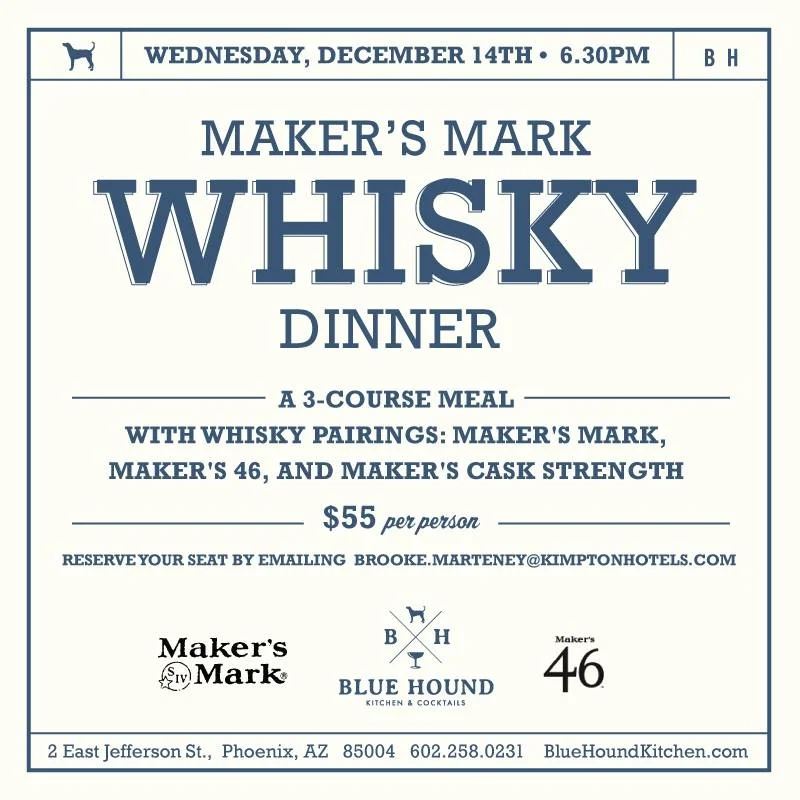 Join Executive Chef Sean Currid for the Maker’s Mark Whisky Dinner at Blue Hound Kitchen & Cocktails at Kimpton Hotel Palomar Phoenix.