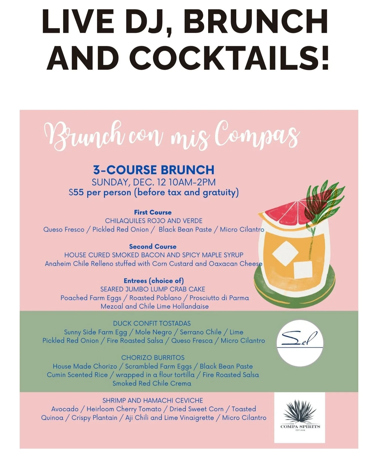 Join Sel on December 12th from 10am-2pm and their friends at Compa Sprits. Enjoy a Mexican Inspired 3 Course Brunch by Chef Branden Levine along with a special brunch drinks menu featuring the Compa Sprits Portfolio. $55 per person excluding tax and service. Drinks additional. RESERVE NOW