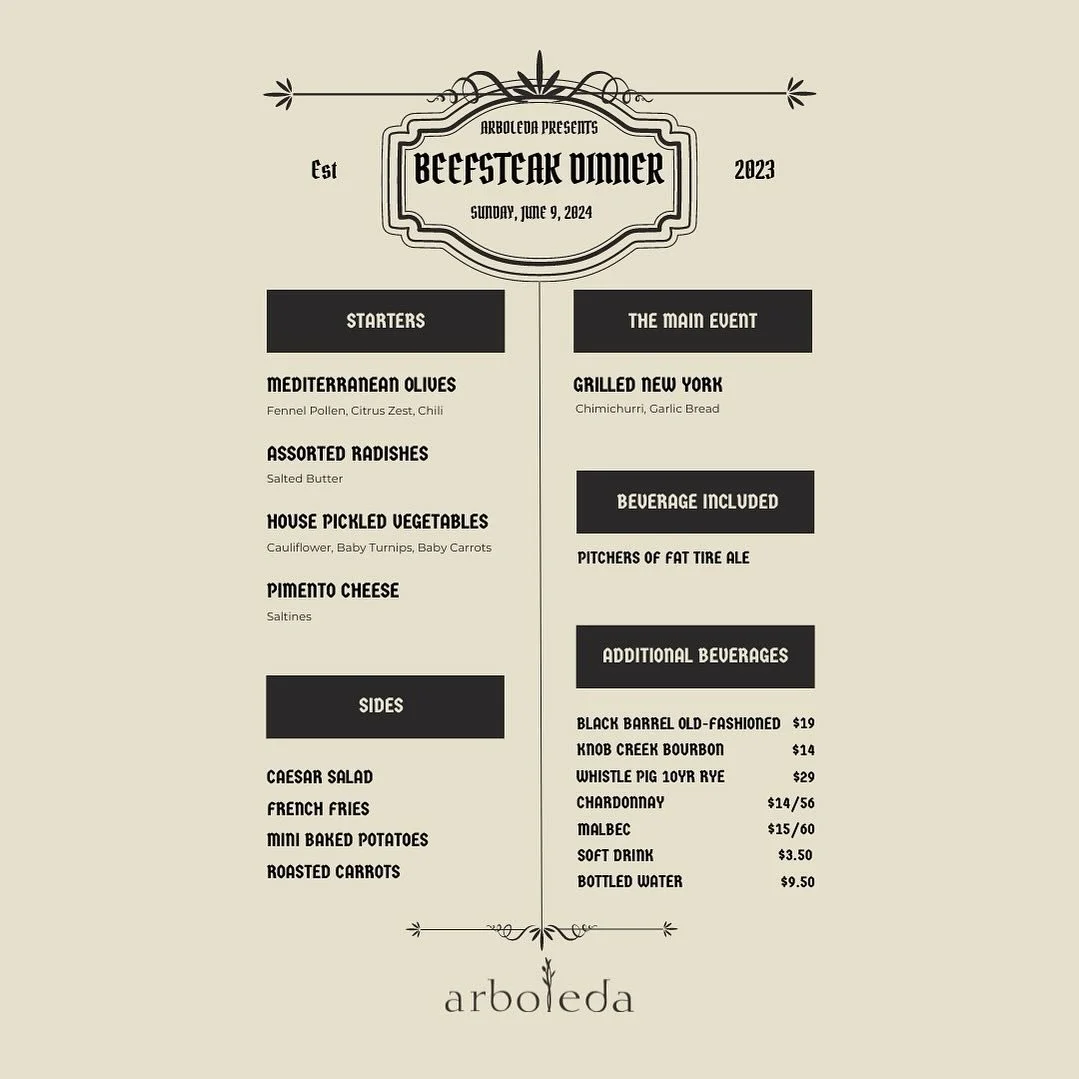 Join Arboleda on Sunday for a classic New York tradition that Arboleda is bringing back to Scottsdale. One night only of endless steak and beer and laughter. $75 per person / $50 for Industry. Call (480) 701-1007 or book through OpenTable.
