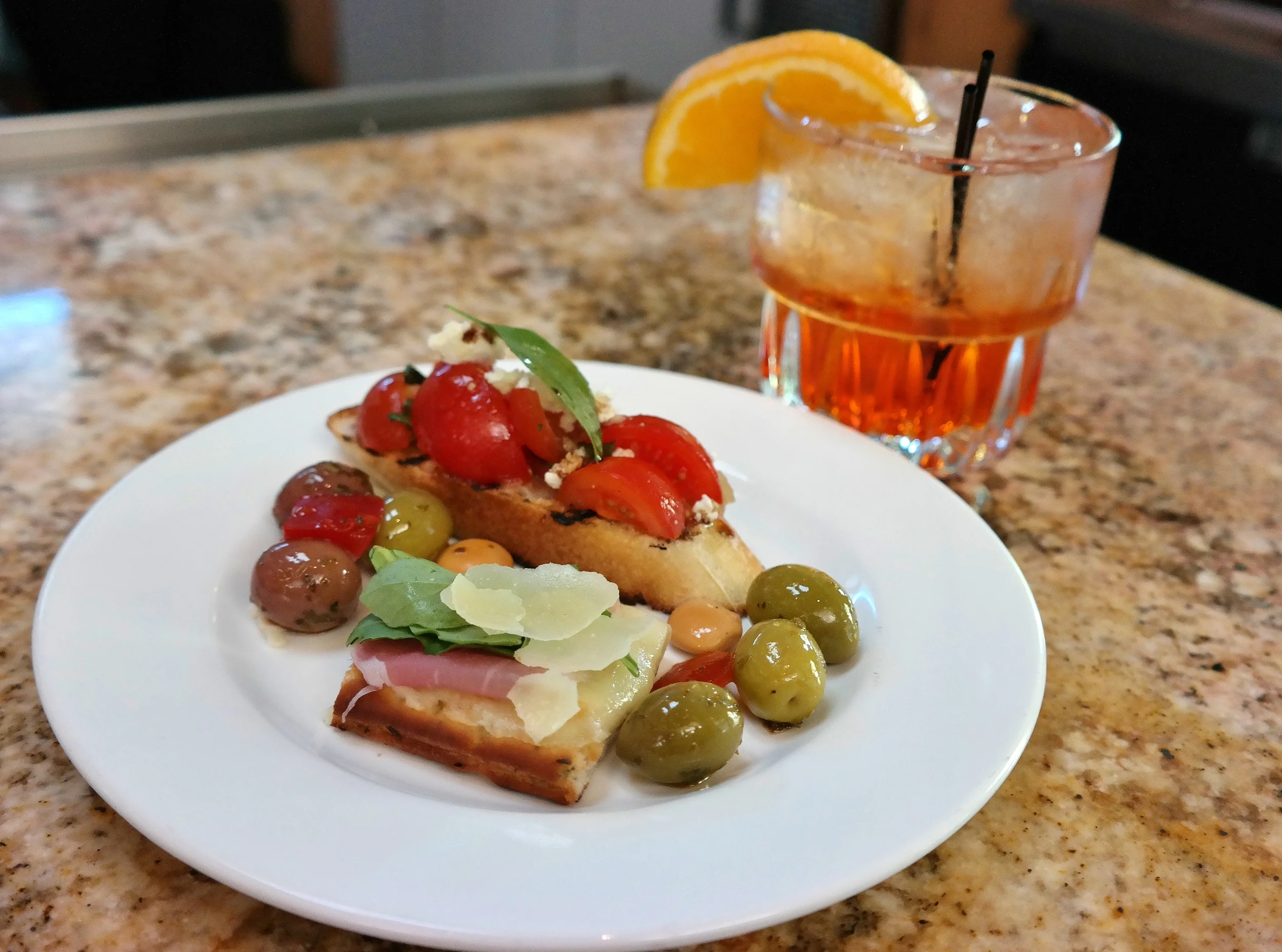 New-Groni (Bulldog gin, white vermouth, fruit infused-Aperol, orange bitters) with bruschetta, olives, pickled lupini beans, and prosciutto flatbread.