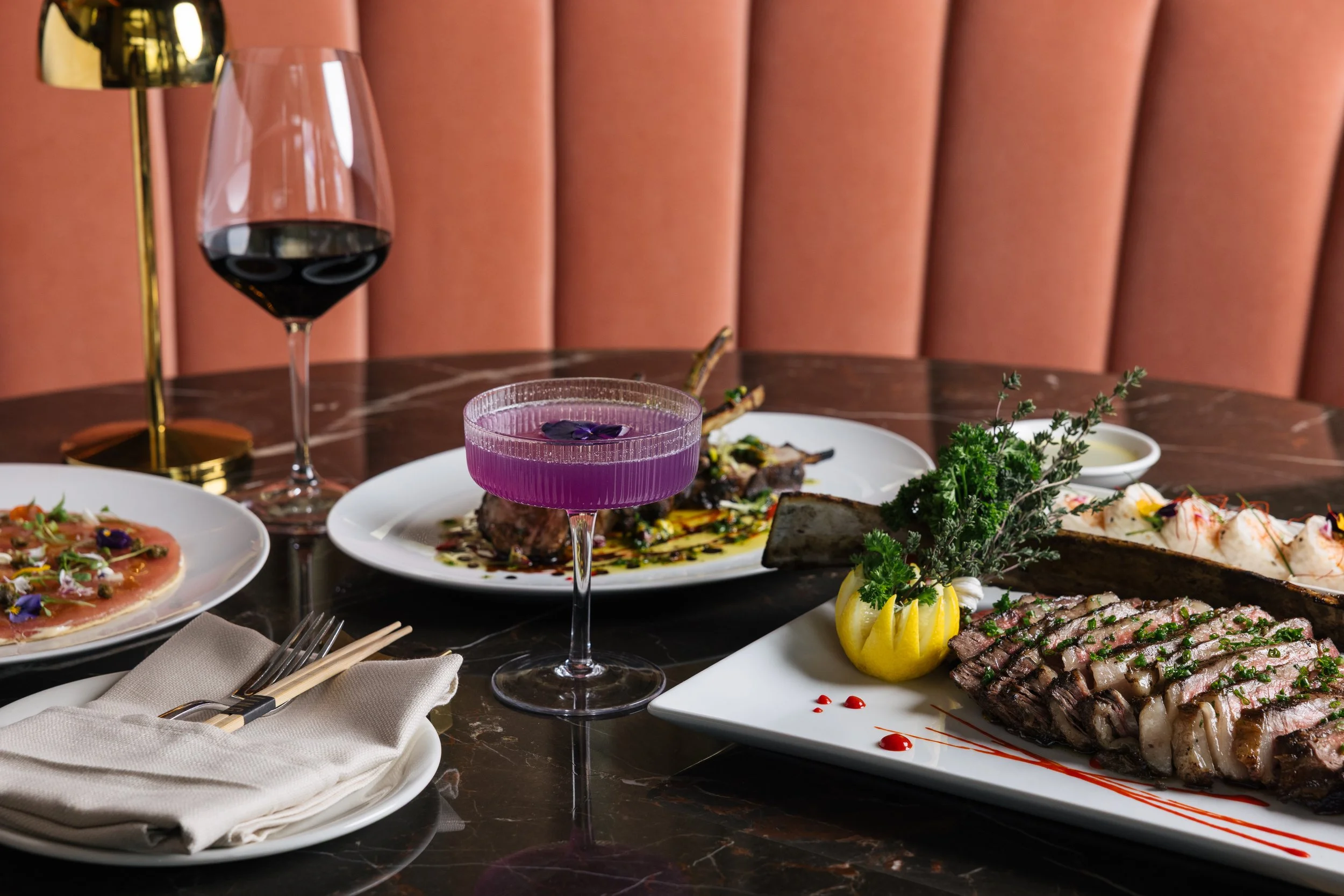 The upscale menu is complemented by a dynamic beverage program that includes an extensive wine list of globally recognized labels and a sake program highlighting premium Junmai Daiginjo selections that pair seamlessly with sushi, seafood, and grilled meats. The cocktail menu showcases Asian-inspired ingredients through modern mixology techniques. Standouts include the Drunken Buddha, a bright, layered blend of citrus-infused vodka, limoncello, and fresh pineapple juice, finished with a tingling Buddha Button garnish; Not White Duck, blending smoky mezcal with the rich cherry depth of Luxardo, brightened by tart tamarind and fresh lemon, and finished with a touch of charcoal for a smooth, inky edge; and Purple Facts, a bold yet refined mix of Purple Tanqueray gin, toasted coconut and fresh lime, finished with silky coconut foam. Seasonal cocktails rotate throughout the year, alongside a curated selection of inventive zero-proof options. The cocktail menu can be found here.