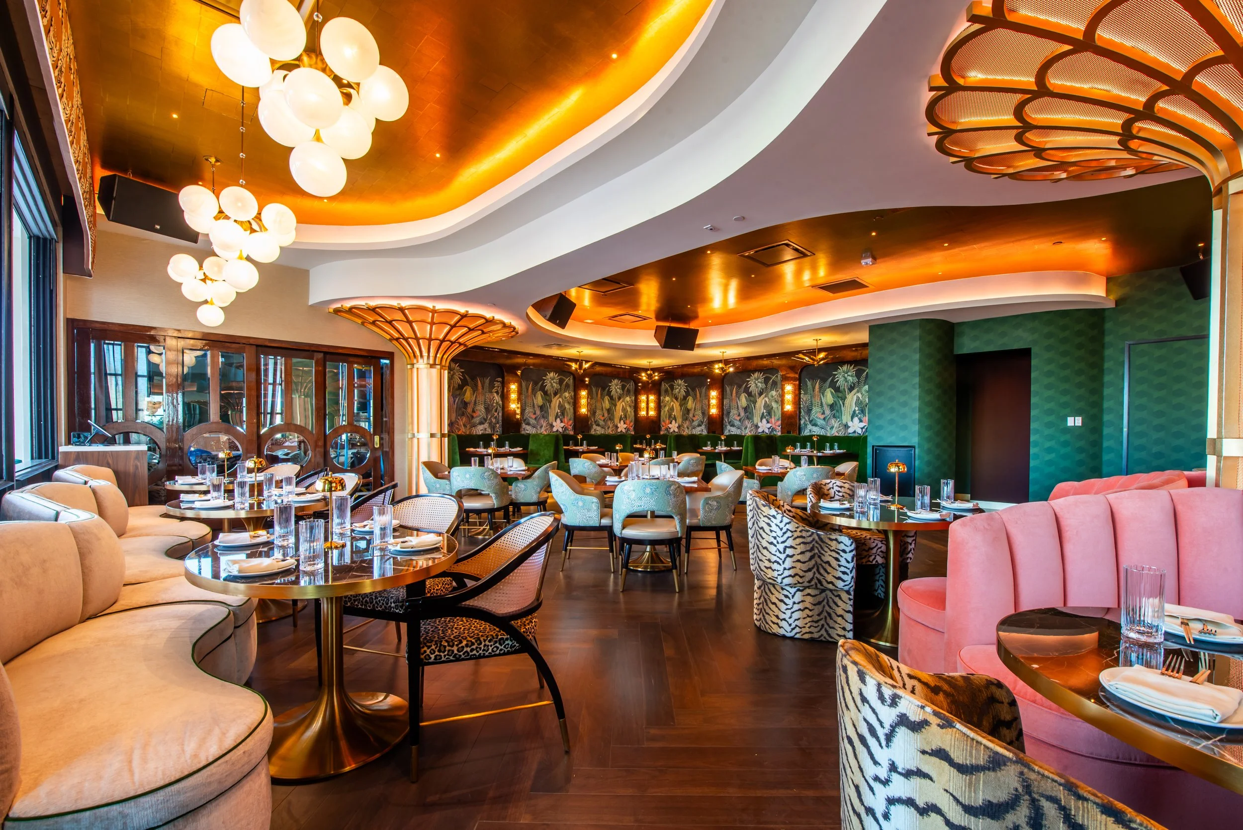 Dramatic waterfall chandeliers, champagne glass–inspired columns, a statement mid-height wraparound bar, plush booth seating and varied ceiling heights accented in gold create a dynamic environment. As the evening unfolds, programmable lighting, shifting chandelier colorways, and immersive audiovisual elements - designed by SoundFX, e11even Sound and Duskworks - work in concert to create the subtle yet intentional energy that defines JING Scottsdale. Extending the experience outdoors, expansive patios feature a sleek fire pit, lounge seating and dining tables for seamless indoor-outdoor flow.
