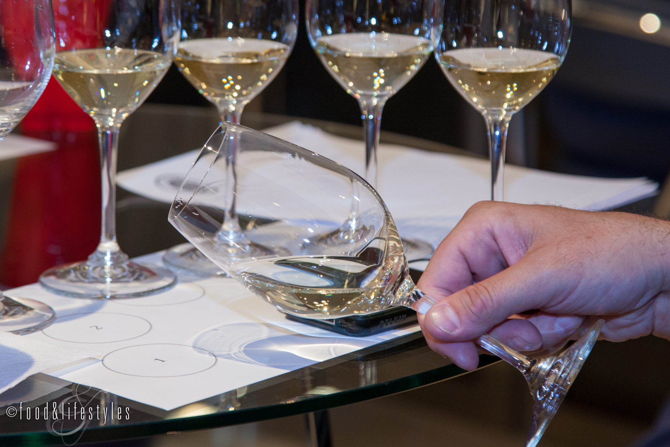Wines were grouped together by style - whites, rosés, red, and sweet. A random number generator then sorted them into flights based on the AVA number, with each flight consisting of six wines (unless a category had an odd number). A pour code marked the panel, flight, and glass position on the judges' tasting mat.